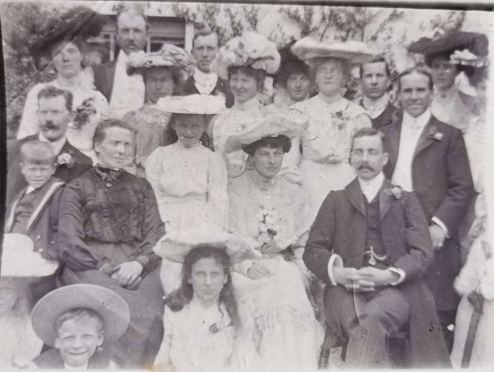 | Margaret JACKSON is referred to as "Aunt Peggy" and she is dressed in balck and to the left of her daughter, the bride. Allen SCUSE (1863-1941), a banker and husband of Maud Martha Elizabeth REED (1878-1958) is behind Aunt Peggy's shoulder (he has a mustache). The Thompson BROWN mentioned, seen in the middle at the back, would have been Thompson BROWN jr (1868-1942). Jeannie Coulter JACKSON (1877-1975) is in the upper right hand side. |